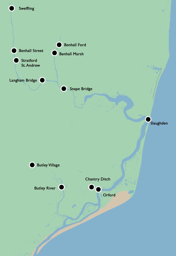 – An opportunity to chart long-term changes in the river system, particularly (1) the improvements expected from updated waste water treatment plants at Benhall, Framlingham and Orford, and (2) implementation of agricultural nitrate inputs in the Nitrate Vulnerable Zone plans (NVZs are areas designated as being at risk from agricultural nitrate pollution).